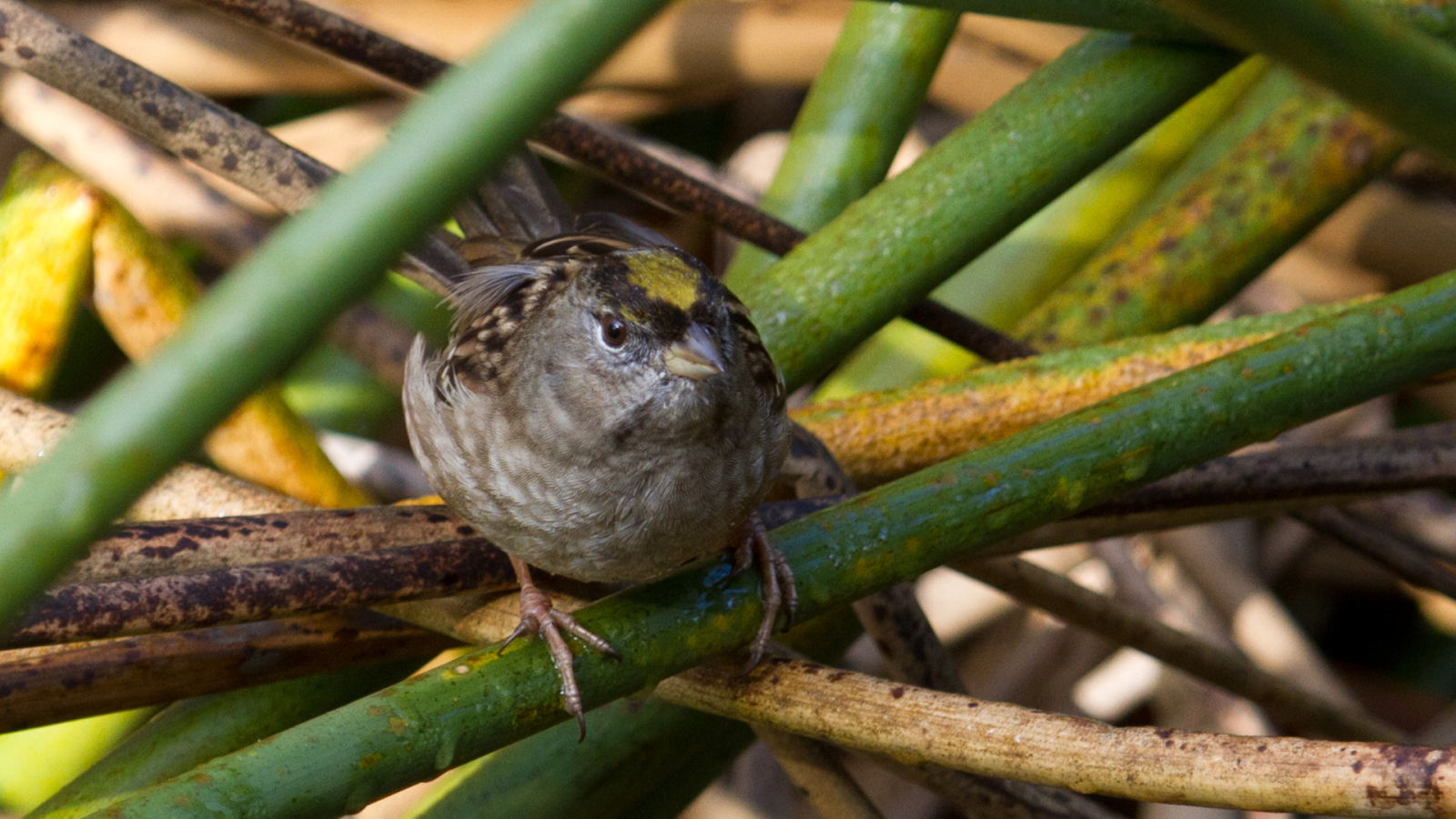 Each fall, golden-crowned sparrows (Zonotrichia atricapilla) make their way to the Bay Area as they migrate south to their wintering grounds along the Pacific flyway. These birds are large sparrows with a distinctive golden patch on top of their heads. A close relatives of the white-crowned sparrow, which can also be found in the Bay Area, the golden-crowned sparrow's winter diet in the Bay Area includes seeds, berries, flowers and buds. This species is an important destroyer of weed seeds, as it feeds on the seeds of invasive bromes, ryegrasses, fescues and more.
