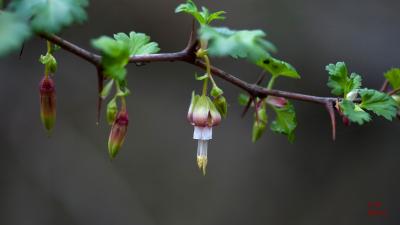 Unlike currants, gooseberry plants develop large, half inch spines along the stems in an attempt to prevent predation from wildlife. The flowers bloom in early winter and produce red berries also covered in many, small spines.