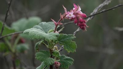 Chaparral currant is endemic to California, where it grows along the slopes of coastal and foothill ranges near manzanita, madrone and bay laurel. A member of the gooseberry family, Ribes malvaceu, has fragrant pink flowers that are known to attract native bees and hummingbirds. The flowers bloom from November to March, then begin developing their edible fruit that is favorited by birds.