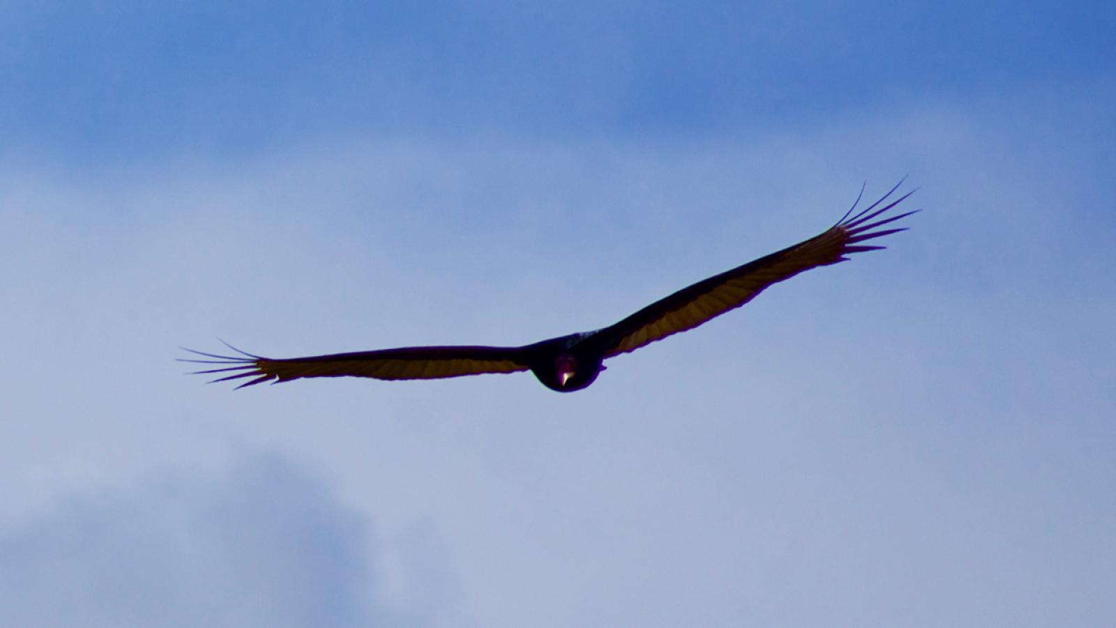 You can often find turkey vultures soaring over grasslands as they try to sniff out a carcass. These birds are very efficient fliers because they use thermals (warm updrafts) to carry them through the sky; they flap their wings very infrequently. The seismic geology in the Santa Cruz Mountains creates tons of thermals to lift a scavenging vulture at it searches for food.